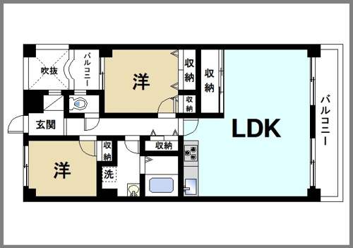 住戸の真ん中に玄関があり、玄関前の廊下から居室が左右に振り分けられているマンションの間取りのこと。この間取りだと廊下に割く面積が少なくなり、その分居室などに使える有効面積が増える。またLDKや客間などのパブリック空間と浴室や個室などのプライベート空間を分けることができて、プライバシーの確保に有効であることや、両面バルコニーを採用できること、通風・採光に優れているなどのメリットがある。賃貸住宅の場合、他の間取りに比べてやや家賃が高い傾向にある。